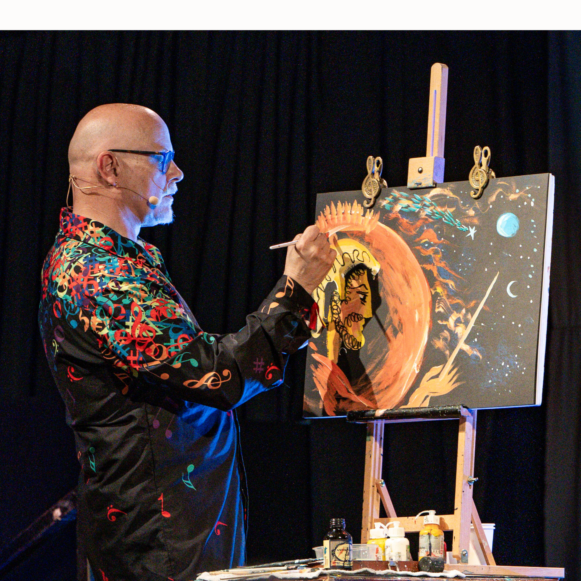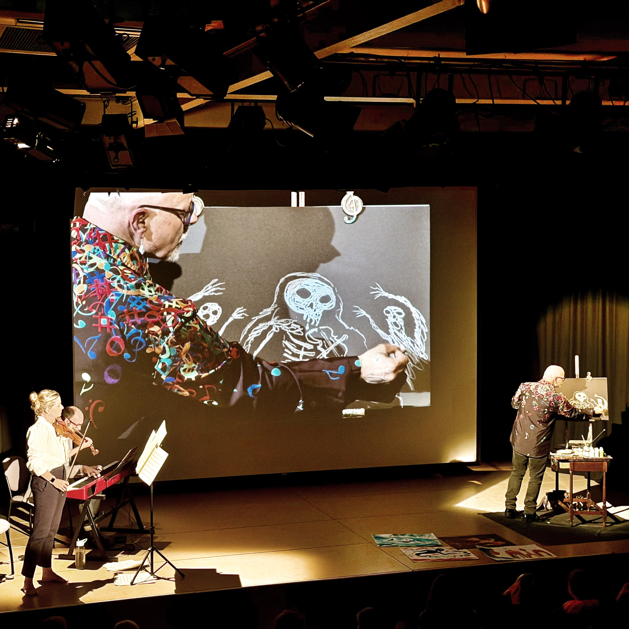 While he is not writing, he is illustrating to music, creating works of art live on stage accompanied by musicians playing classical masterpieces.